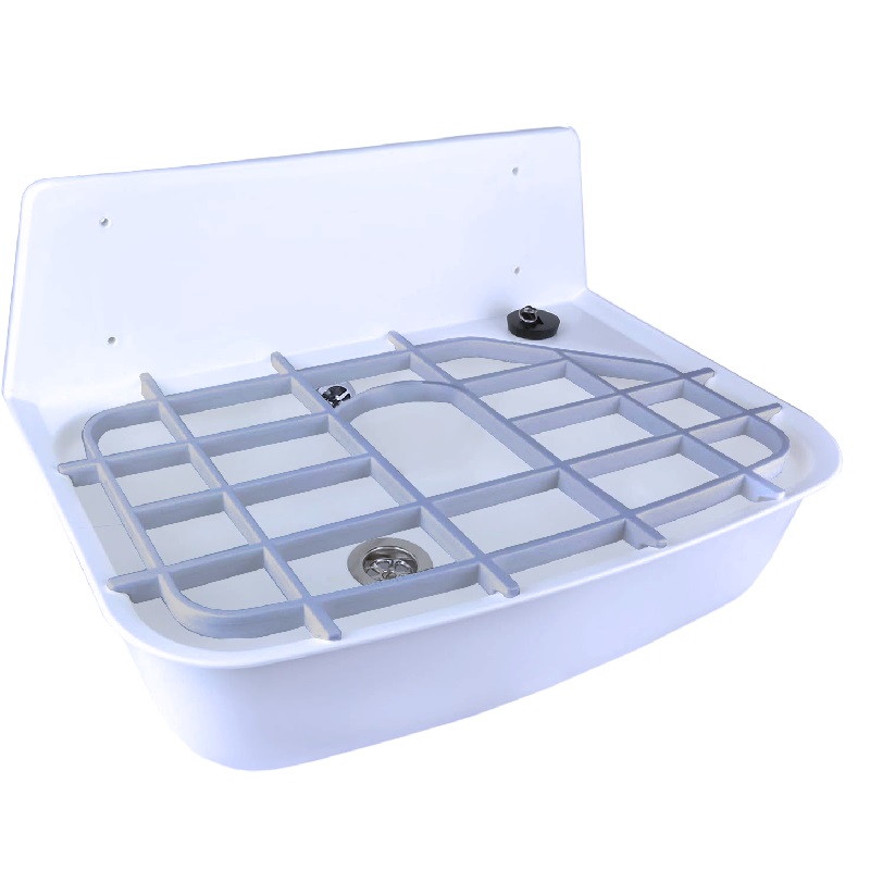 Пластмасова стена мивка (бяла) с отвор за смесител, със сифони и пластмасова решетка